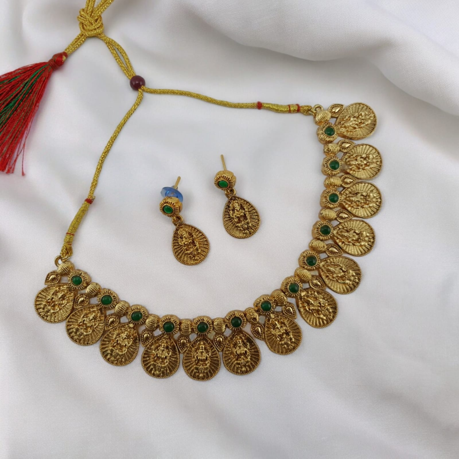 Elevate your style with the exquisite Laksmi Gold toned Coin Necklace Set from jewel4u. This stunning set features intricately designed gold toned coins with Laksmi motifs, symbolizing prosperity and abundance. The necklace is perfect for adding a touch of elegance to any outfit, while the matching earrings complete the look with effortless sophistication. Crafted with the highest quality materials, this necklace set is sure to become a timeless favorite in your jewelry collection. Make a statement with the Laksmi Gold toned Coin Necklace Set from jewel4u.